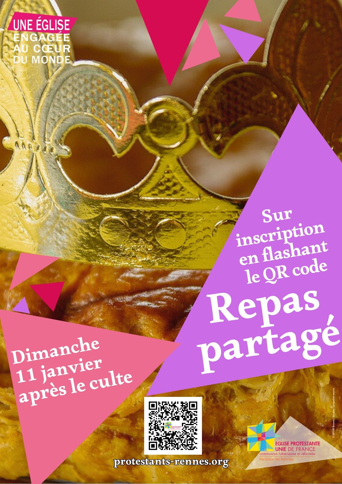 Inutile de ramener un dessert; le conseil presbytéral offre la galette des rois. En revanche, pour avoir une idée du nombre de galettes à commander, il est demandé de s’inscrire auprés de Sara Claire (president.EPURennes@outlook.com) ou sur la feuille d’inscription disponible dans la salle Paul Ricoeur au temple.