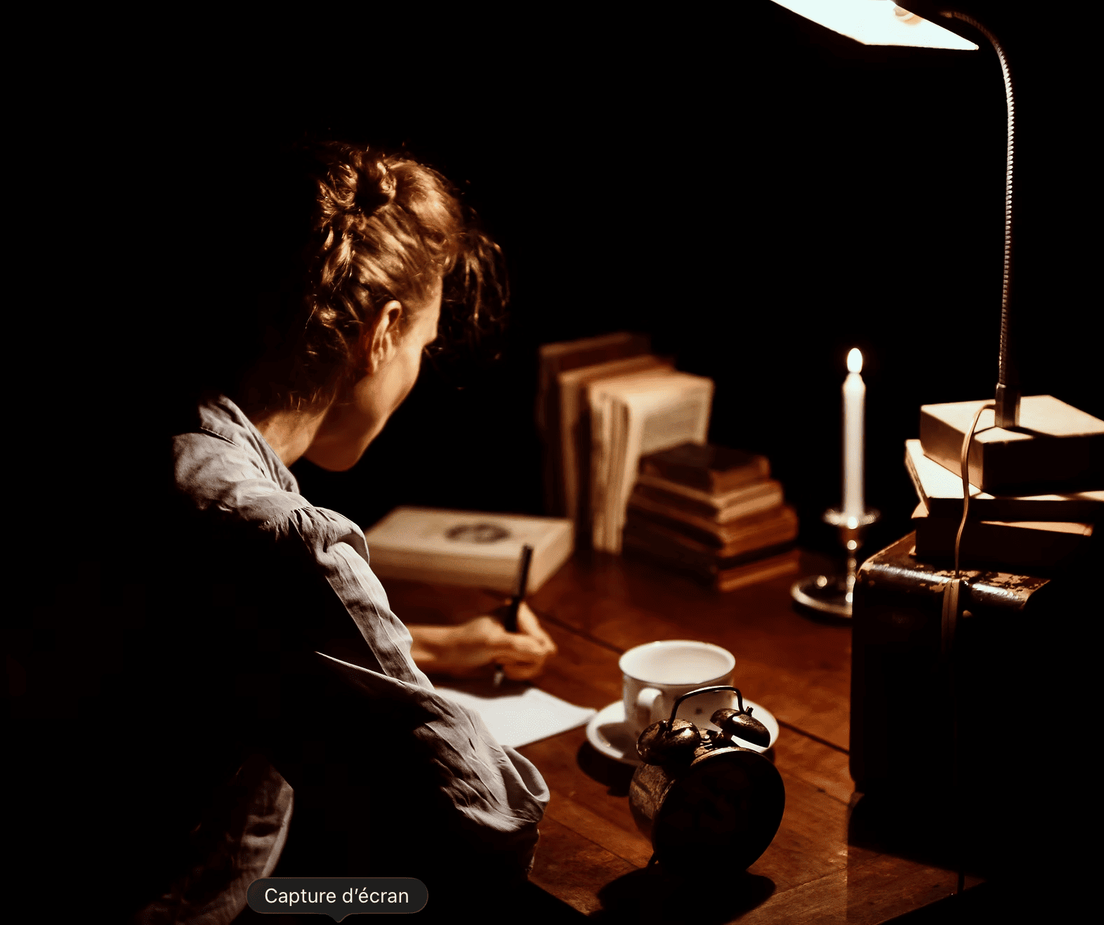 Une petite table, une chaise, une lampe et quelques accessoires constituent l’essentiel de la scénographie.