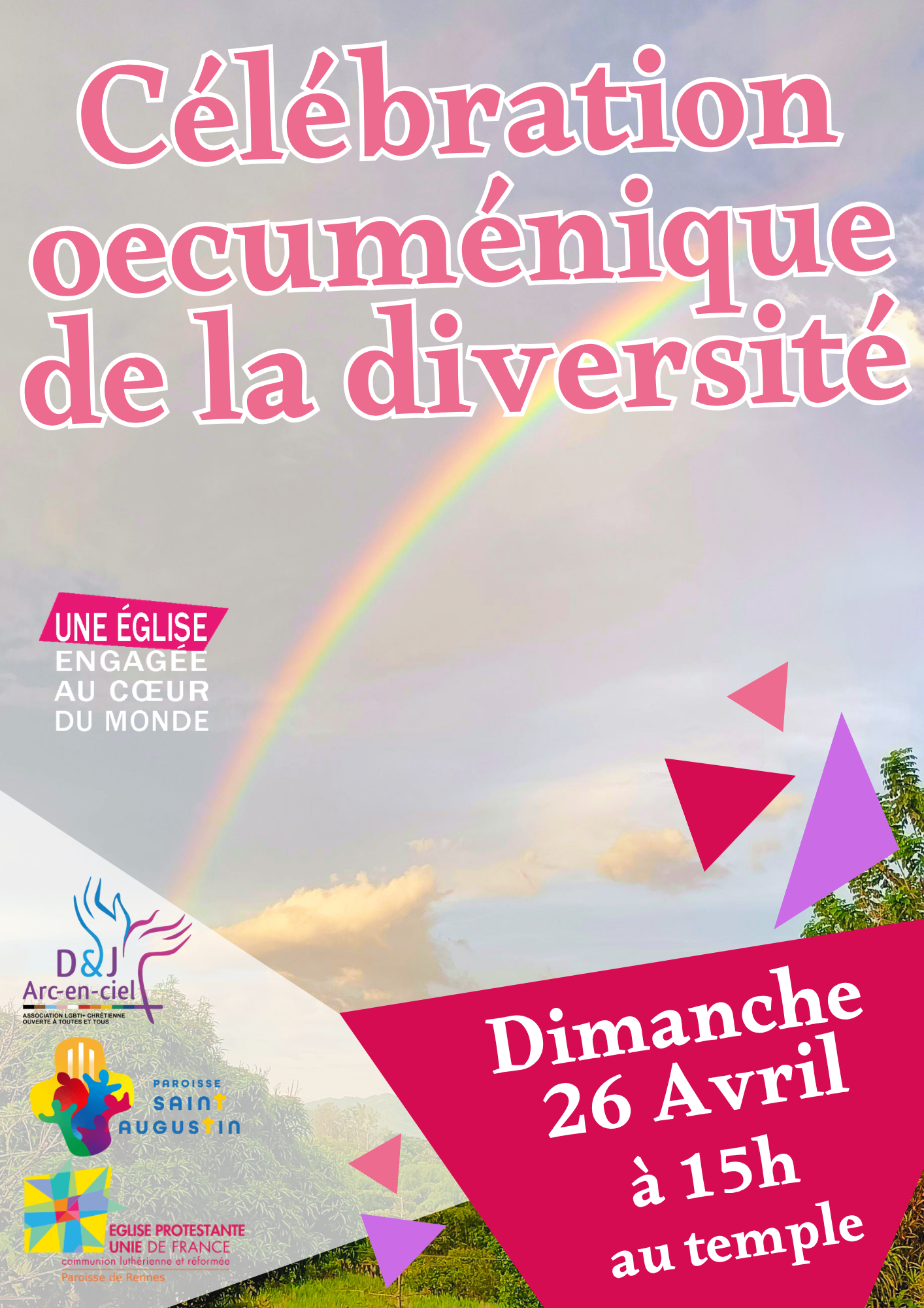 Le dimanche 26 avril à 15h, nous vous invitons à participer à une célébration œcuménique inclusive, pensée comme un moment de prière, d’écoute et de partage pour les personnes LGBTQIA+, leurs proches, et toute autre personne souhaitant vivre ce moment.