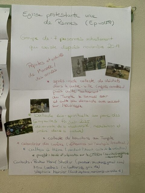 De refaire le tour de nos activités en préparant l’affiche de notre groupe Eglise verte, de faire connaissance à travers un ‘Bingo’, d’entendre la conférence de Charlotte, d’échanger avec les unes et les autres autour de nos idées, nos réussites, nos échecs, de les déposer devant Dieu dans la prière, de nous inspirer et nous encourager mutuellement, et d’avoir un espace lors de l’atelier aussi pour la colère et le désespoir avant de nous remettre en route ensemble étaient des vrais cadeaux pour moi.