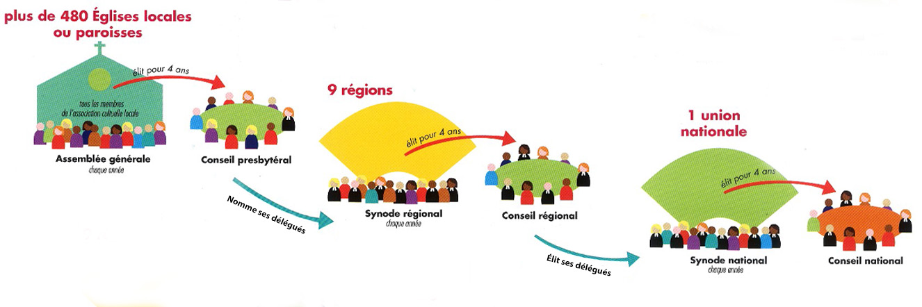 Le conseil presbytéral est élu localement par l’Assemblée générale de la paroisse. Ses délégués siègent au synode régional qui élit le Conseil régional. Certains délégués régionaux votent au Synode national qui élit le Conseil national.